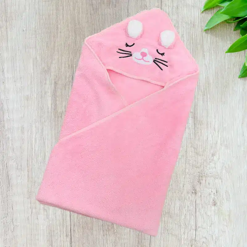 Baby Kapuzen-Badetuch “Katze” 1 Stück Maße: ca. 80cm x 80cm Material: Polyester Farbe: Rosa Alter: ca. 0 – 6 Monate