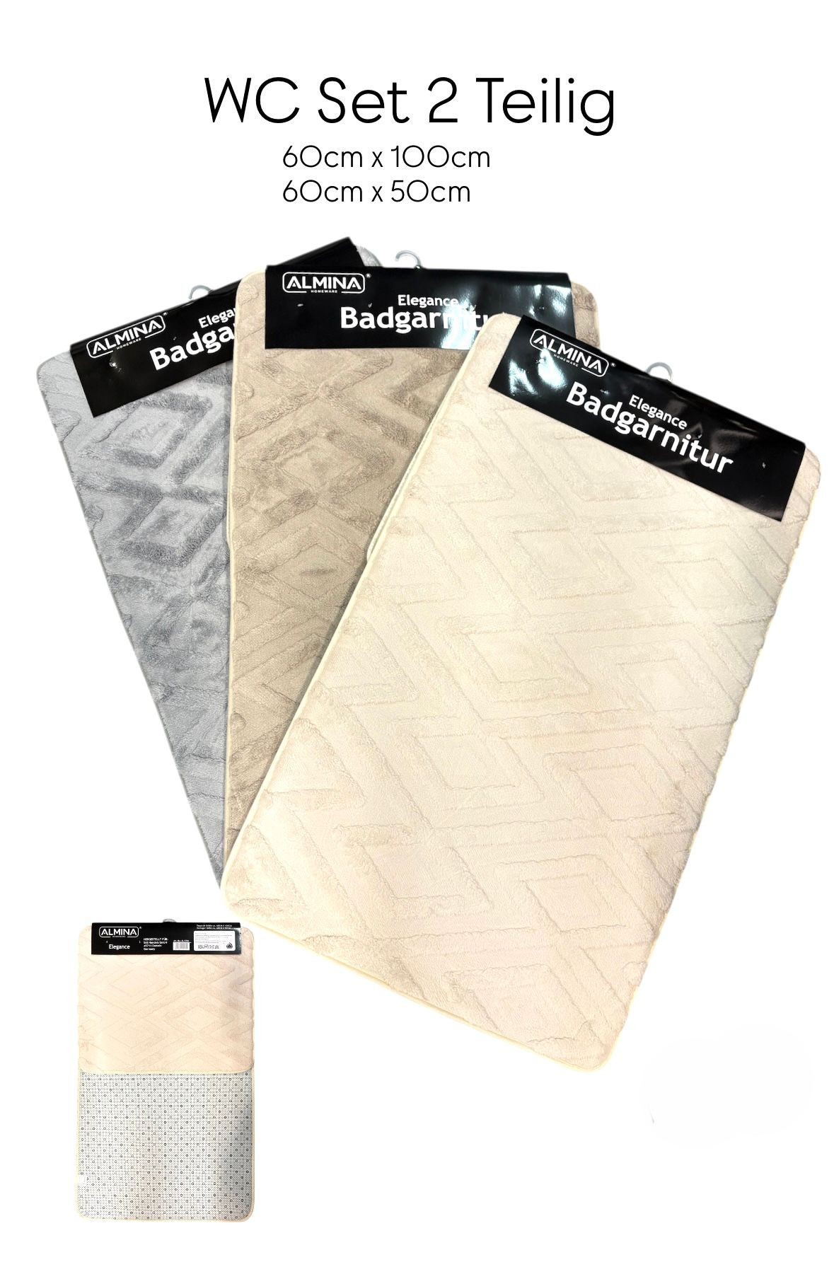 “Elegance” Badgarnitur 2 teilig Maße: ca. 100cm x 60cm / 50cm x 60cm Material: Polyester Rutschfeste Unterseite Farbe: Grau | Creme | Beige