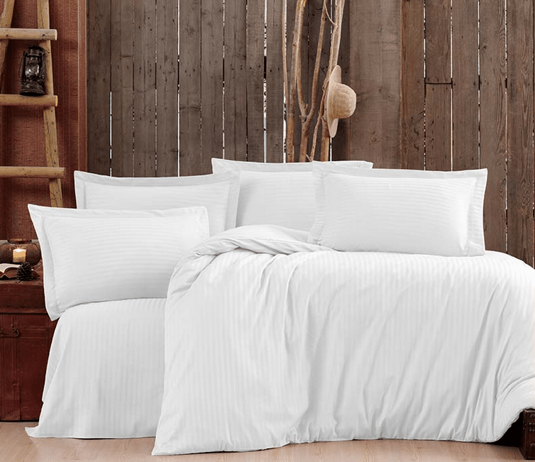 “Line” Bettwäsche Set 6 teilig 1x Bettbezug ca. 200cm x 220cm 1x Bettlaken ca. 240cm x 260cm 4x Kissenbezüge ca. 50cm x 70cm Farbe: Weiß Material: 100% Baumwolle