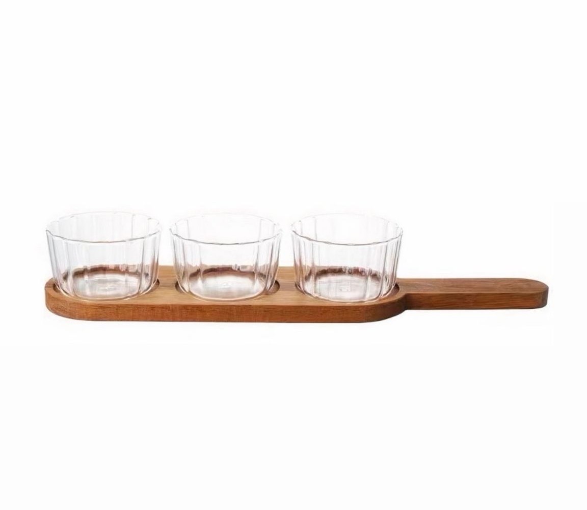 “Luana Buccia” 4 teilig Volumen: ca. 260cc Durchmesser je Schale: ca. 9cm Material: Glas / Akazienholz Nicht Spülmaschinen geeignet