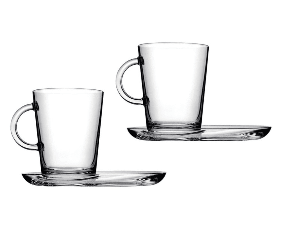 Pasabahce “Tribeca” 4 teilig 2x Henkelgläser 2x Unterteller Volumen: ca. 400cc Material: Glas Spülmaschinen geeignet
