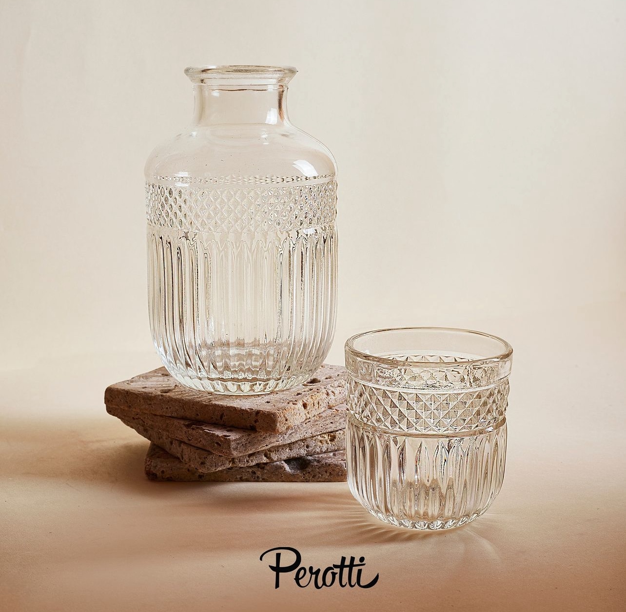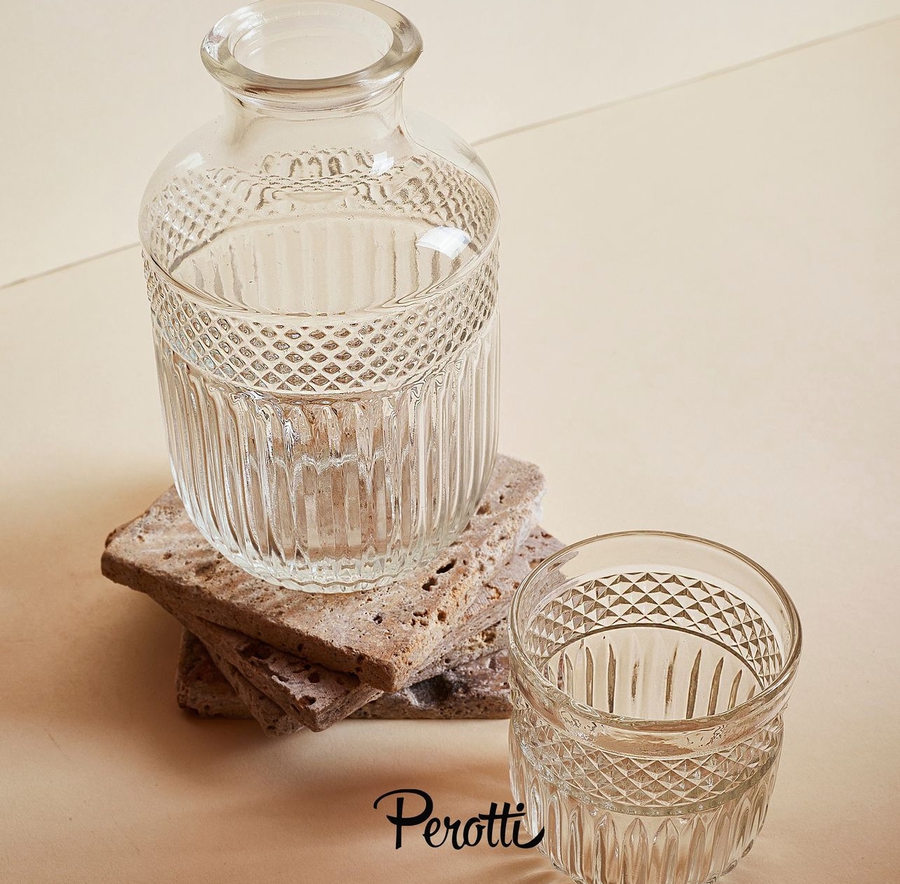 Perotti “Morry” 2 teilig 1x Karaffe 1x Glas Volumen: ca. 325cc Höhe: ca. 20cm Material: Glas Spülmaschinen geeignet