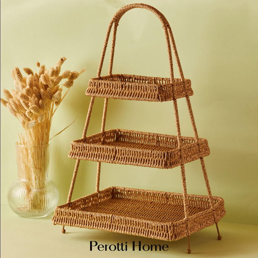“Rattan” Etagere 1 Stück Gesamthöhe: ca. 51cm Maße: ca. 13cm x 18cm (oben) / ca. 18cm x 24cm (mitte) / ca. 24cm x 29cm (unten) Material: Rattan Form: Rechteck Nicht Spülmaschinen geeignet