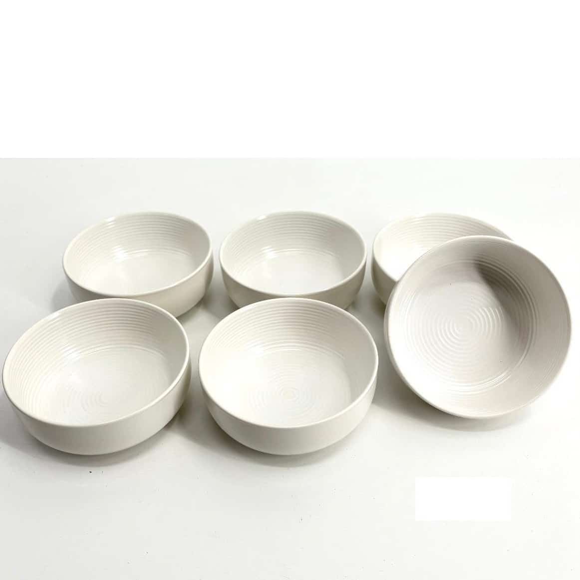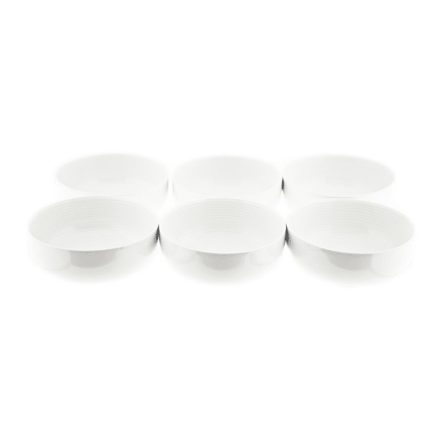 “Rondo” Schalen 6 Stück Volumen: ca. 200cc Durchmesser: ca. 11cm Höhe: ca. 4,5cm Material: Porzellan Farbe: Weiß