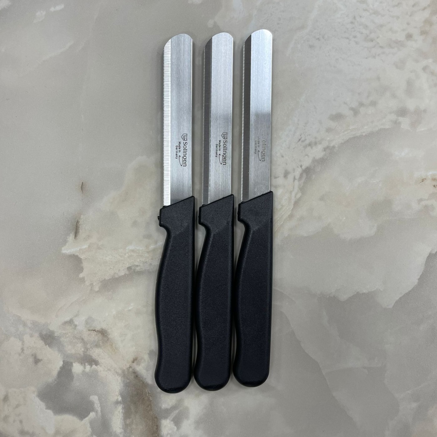 Solingen Zubereitungsmesser 1 Stück oder 3 Stück Länge: ca. 22cm Klinge: ca. 10cm Farbe: Schwarz Material: Kunststoff / 18/10 Edelstahl 100% original Solingen Qualität