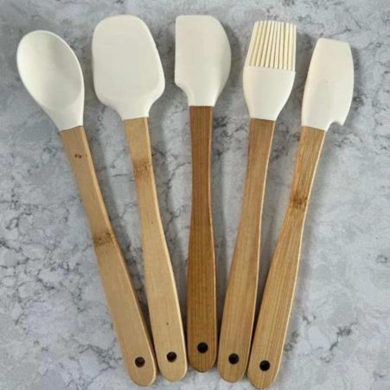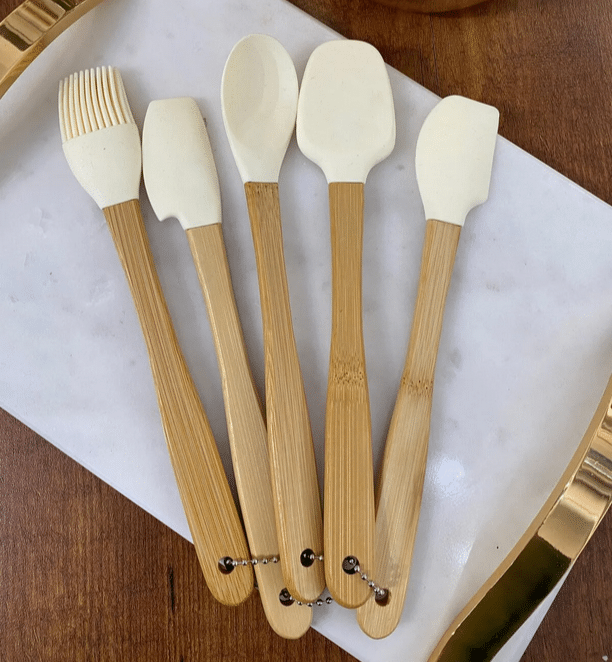 Mien “Spatula” 5 teilig Länge: ca. 20cm Material: Bambus / Silikon Farbe: Creme Für den Gebrauch mit Lebensmitteln geeignet