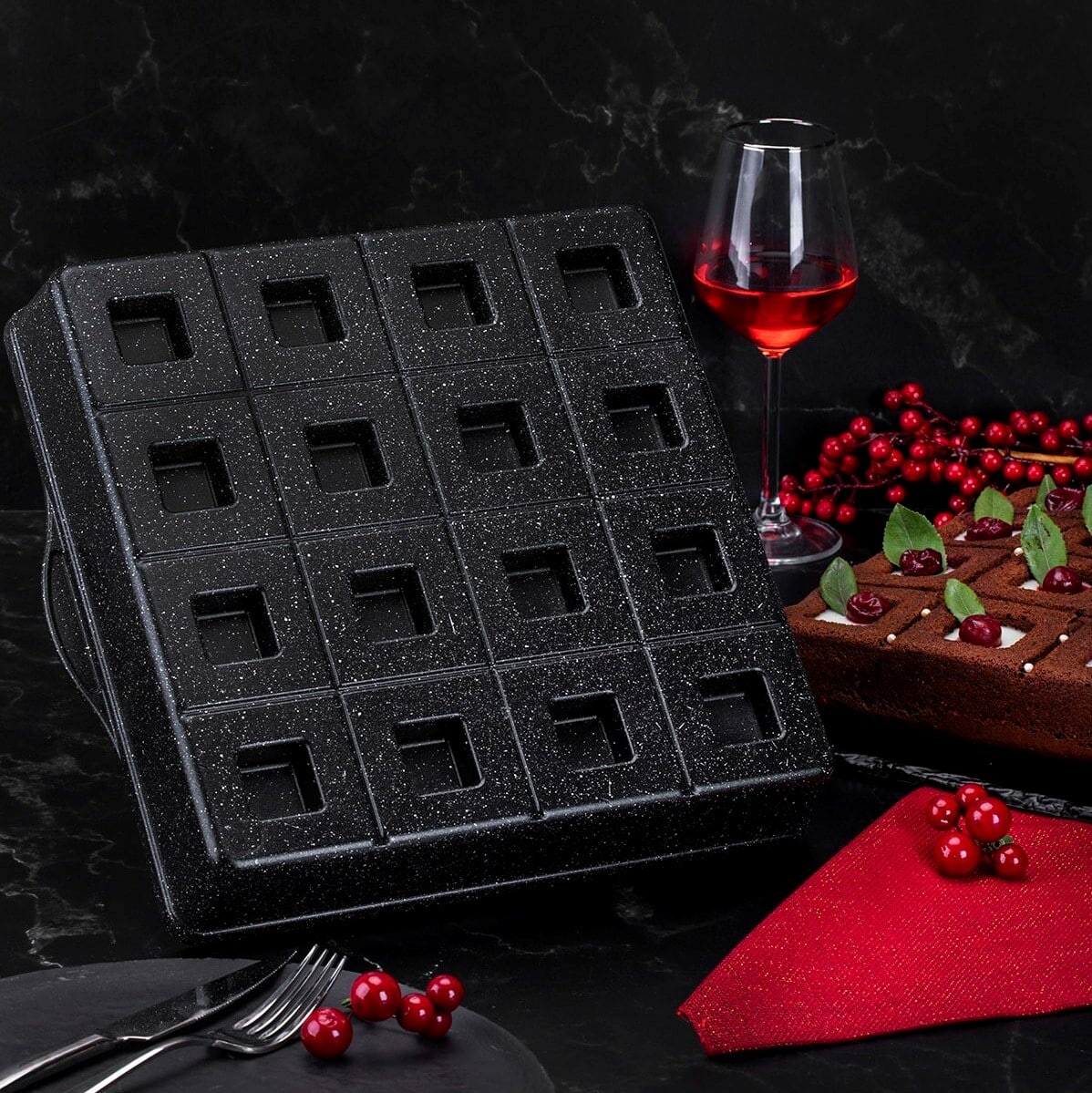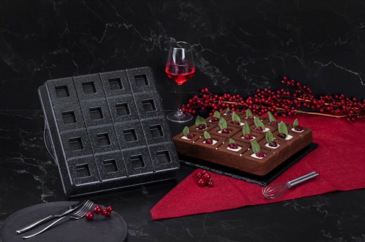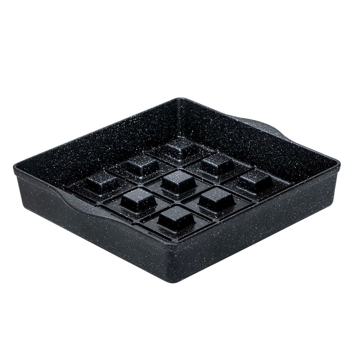 Tac Backform “Brownie” 1 Stück Maße: ca. 29cm x 29cm Tiefe: ca. 6cm Gewicht: ca. 1300gr Material: Granit-Guss Farbe: Schwarz Extra große Form für 16 Brownie Stücke Doppelte Zutatenmenge empfohlen!