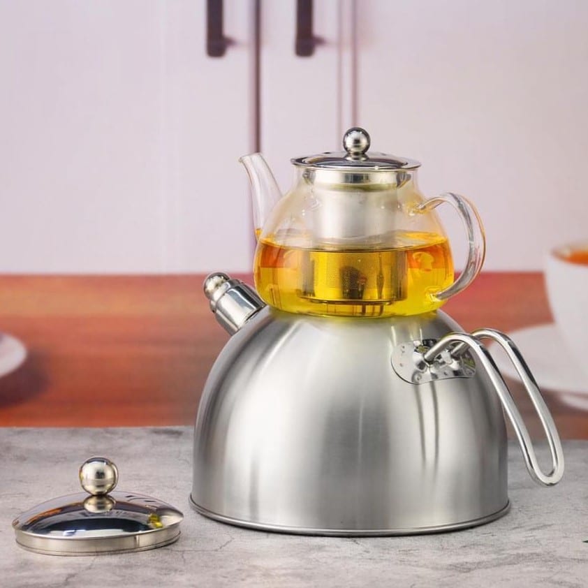 Wasserkessel mit Teekanne 1x Teekanne 1x Wasserkessel Volumen: ca. 600ml / 3000ml Material: Borosilikatglas / Edelstahl Farbe: Silber Kessel mit Pfeiffunktion Am Deckel integrierter Sieb Für Induktion geeignet